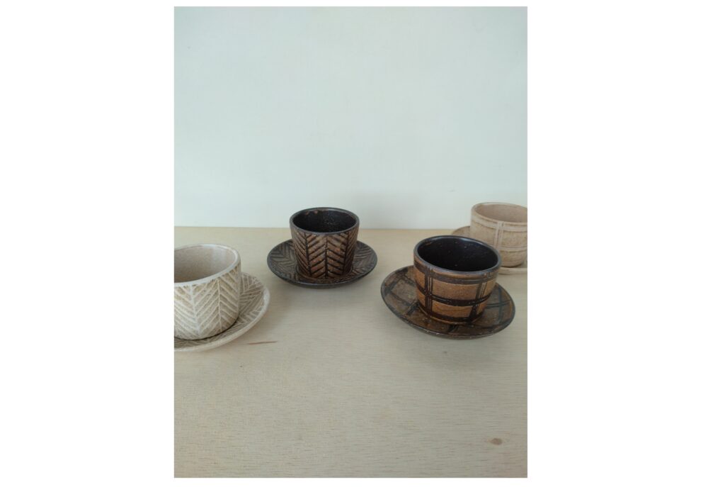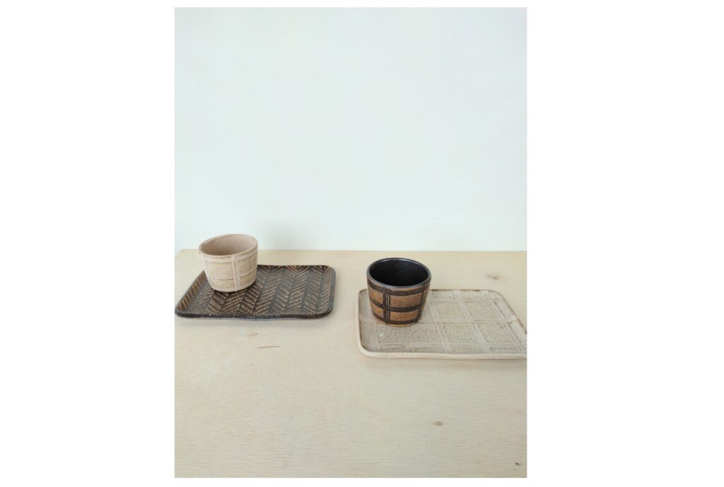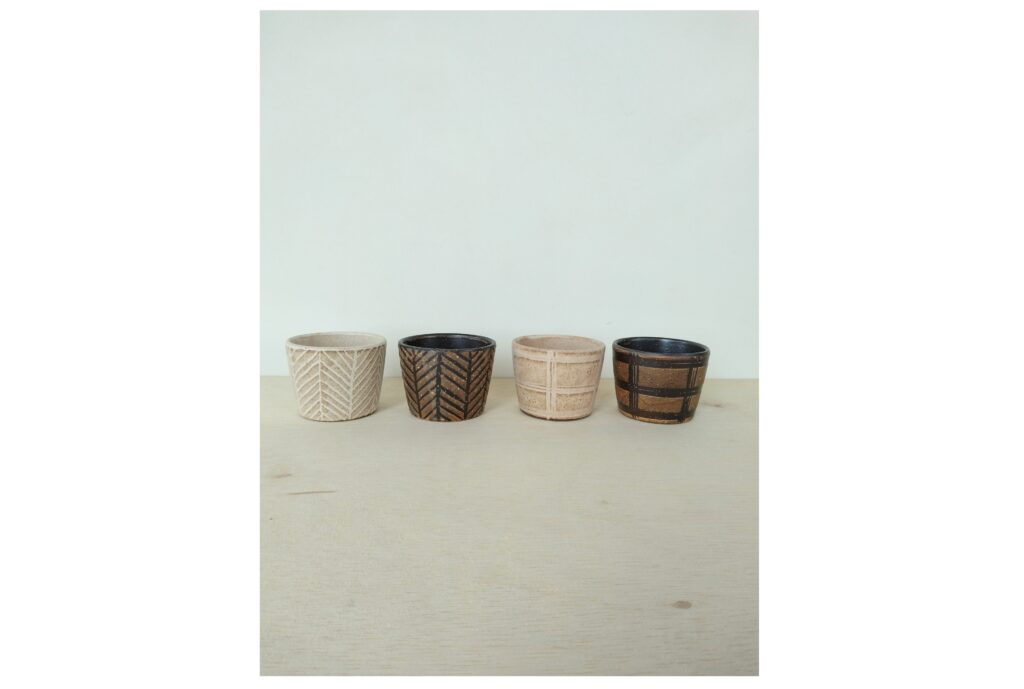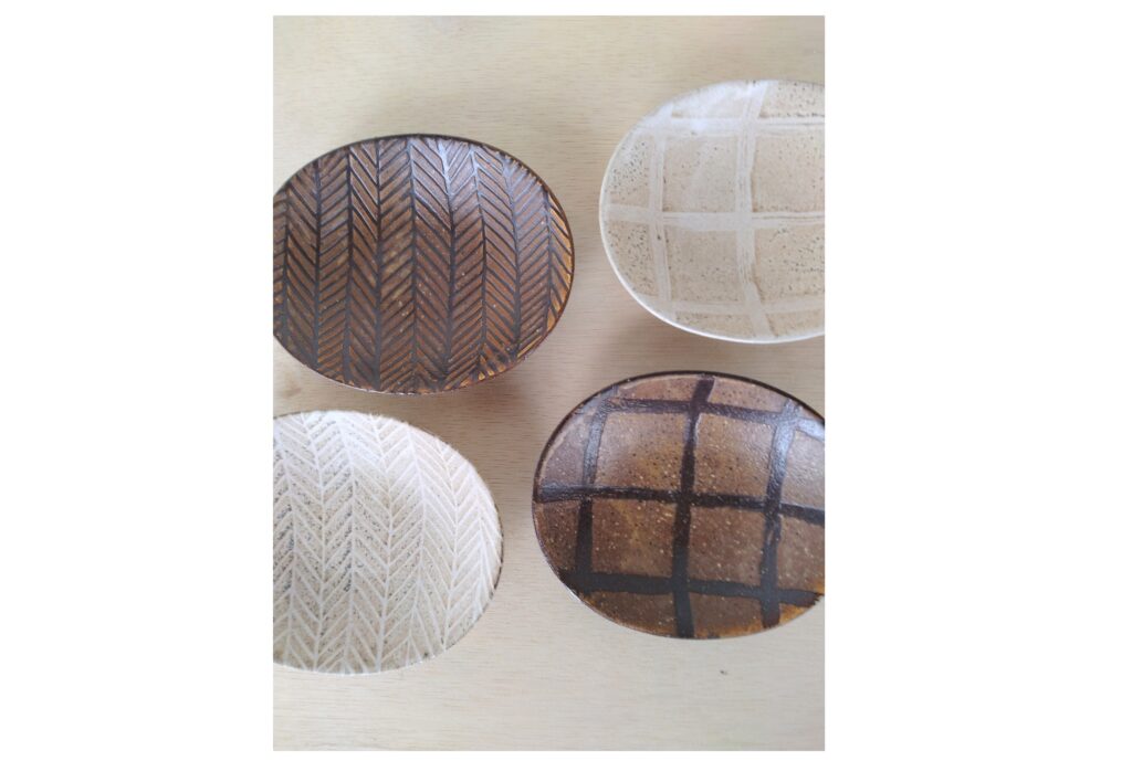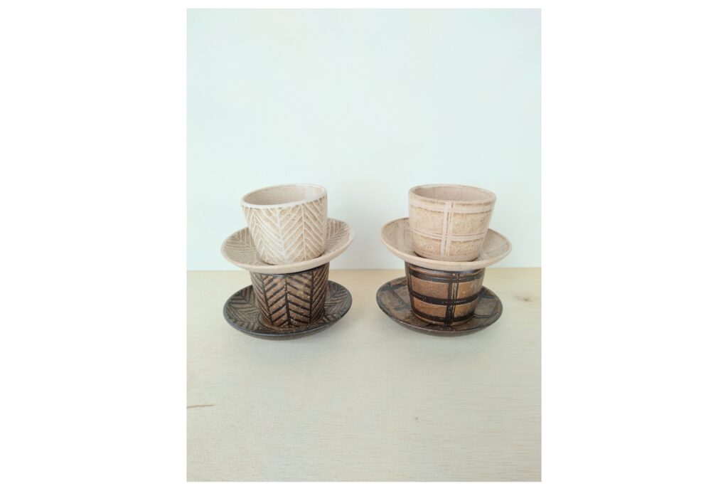 ヘリンボンやチェックの柄はすべて手描きです。手描きならではの線の表情や釉薬の濃淡がよく出ています。