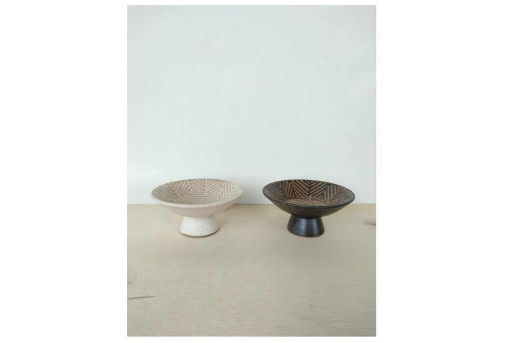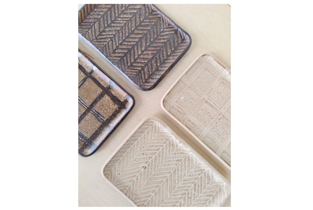 たたら角皿とミニカップ、3寸皿は色と柄が揃っているので組み合わせて使えます。